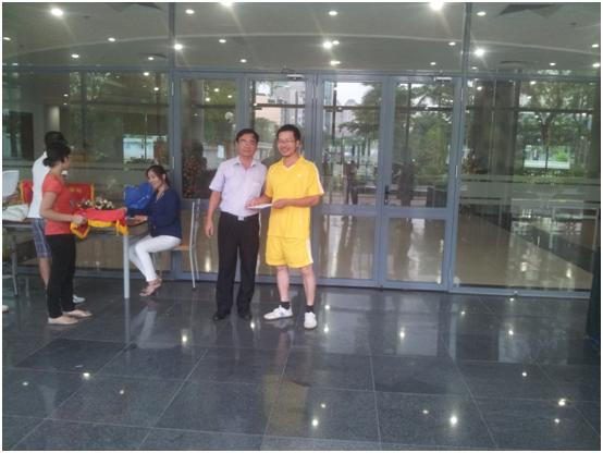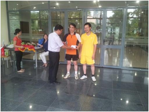 Đồng chí Nguyễn Đức Tuấn - Chủ tịch Công đoàn cơ quan Bộ trao giải Nhất đôi Nam dưới 45 tuổi