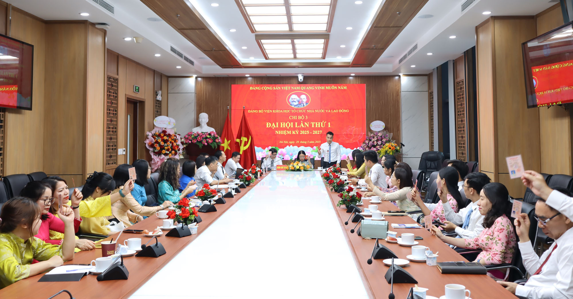 Chiều ngày 29/5/2025, tại trụ sở Bộ Nội vụ, số 37 Nguyễn Bỉnh Khiêm, Hà Nội, Chi bộ 3 thuộc Đảng bộ Viện Khoa học Tổ chức Nhà nước và Lao động (Viện KHTCNN&LĐ) đã long trọng tổ chức Đại hội Chi bộ 3 lần thứ I, nhiệm kỳ 2025-2027. Đồng chí Lê Anh Tuấn - Ủy viên Ban Chấp hành Đảng bộ Bộ Nội vụ - Bí thư Đảng ủy - Viện trưởng Viện Khoa học Tổ chức Nhà nước và Lao động tới dự và chỉ đạo Đại hội. Tham dự Đại hội còn có các đồng chí ủy viên Ban Thường vụ Đảng bộ Viện, đại diện Chi ủy Chi bộ 1 và Chi bộ 2 trực thuộc Đảng bộ Viện; Đại diện Đảng ủy Viện, Ban Chấp hành Công đoàn, Đoàn Thanh niên Viện và 24/24 đảng viên Chi bộ 3 KHTCNN&LĐ tham dự đầy đủ.