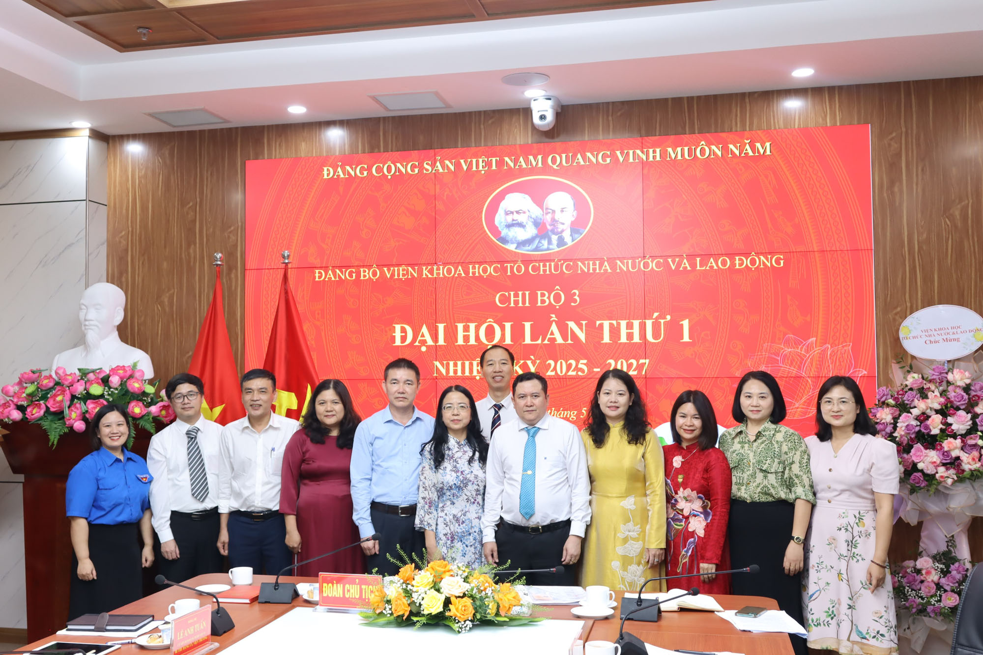 Đồng chí Bí thư Đảng ủy – Viện trưởng Viện KHTCNN&LĐ Lê Anh Tuấn và các đại biểu tham dự Đại hội chúc mừng Ban Chi ủy Chi bộ 3 nhiệm kỳ 2025-2027