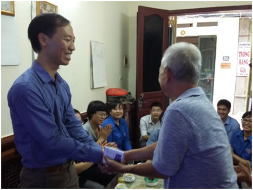 Đồng chí Trần Văn Khánh, Bí thư Đoàn Thanh niên tặng quà cho ông Vũ Văn Thái là thương binh, có đạn trong người, thường xuyên bị đau ốm
