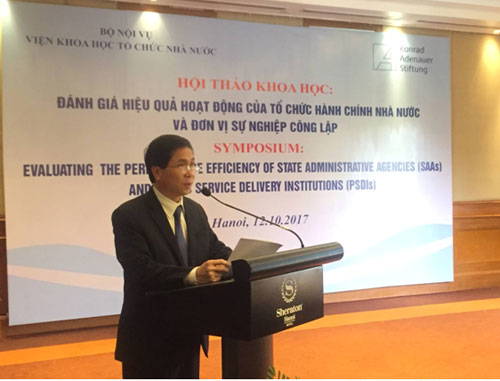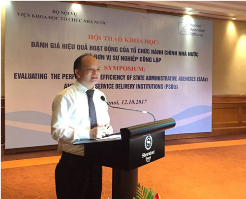 Ngày 12/10/2017 tại Hà Nội, Viện Khoa học tổ chức nhà nước, Bộ Nội vụ (Viện KHTCNN) đã phối hợp với Văn phòng Viện KAS (Cộng hòa Liên bang Đức) tổ chức Hội thảo “Đánh giá hiệu quả hoạt động của tổ chức hành chính nhà nước và đơn vị sự nghiệp công lập”(Hội thảo).