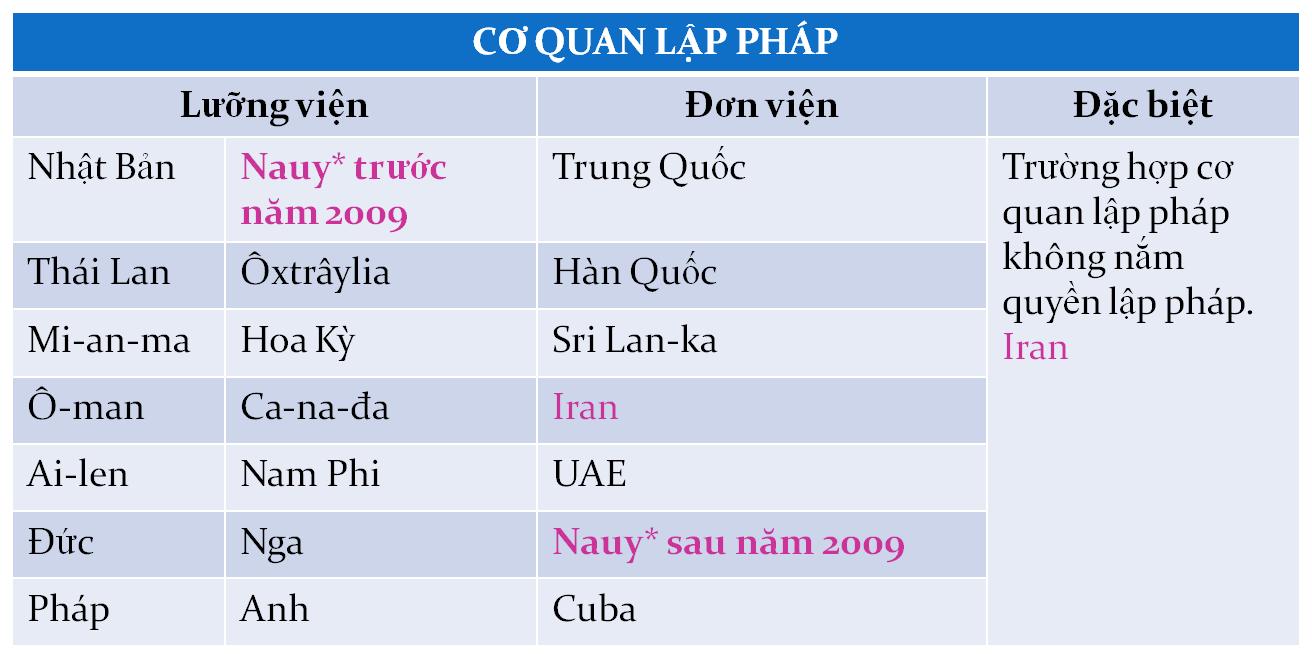 Xét về cơ quan lập pháp, các quốc gia được nghiên cứu đều có Nghị viện. Kết quả nghiên cứu chỉ ra rằng đa số các quốc gia hiện nay đều duy trì chế độ lưỡng viện (Thượng viện và Hạ viện), trong đó Hạ viện thường có quyền lực lớn hơn Thượng viện. Bên cạnh các quốc gia duy trì lưỡng viện trong nhánh lập pháp, vẫn có một số quốc gia đi theo cơ cấu nghị viện đơn viện (một viện, thường gọi là Quốc hội). Na-uy trước năm 2009 có 2 viện lập pháp, tuy nhiên do Thượng viện hầu như không có quyền quyết định nên sau 6 năm (kể từ năm 2003), Na-uy đã sáp nhập 2 viện làm 1 và theo cơ cấu đơn viện. Đối với Iran, tuy quốc gia Cộng hòa Hồi giáo này có nghị viện nhưng hầu như không có vai trò lập pháp mà hầu hết chỉ tham vấn cho Lãnh tụ Hồi giáo.