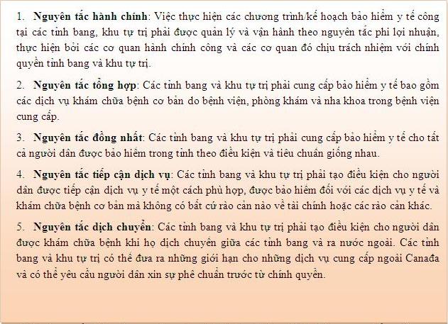 Vai trò của nhà nước trong lĩnh vực y tế được thể hiện trong Hiến pháp Canađa. Trong đó, chính quyền các cấp, đặc biệt là cấp liên bang và cấp tỉnh bang đều có vai trò nhất định. Về cơ bản, chính quyền liên bang có vai trò hình thành các quy định, chuẩn mực và các nguyên tắc hoạt động cơ bản của hệ thống y tế trên cả nước còn các tỉnh bang có nghĩa vụ phải triển khai thực hiện các nguyên tắc đó. Các Nguyên tắc này hiện nay được quy định trong Đạo luật Y tế Canađa, bao gồm 5 nguyên tắc sau: