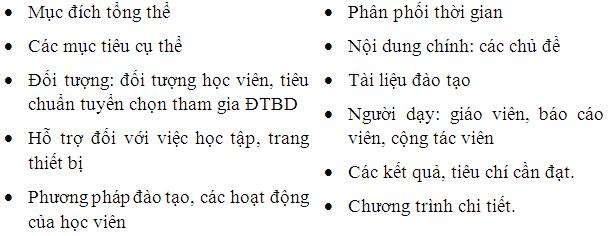 Để giúp cho việc thực hiện công tác tổ chức ĐTBD, người ta đưa ra các công việc cần thực hiện trong thiết kế chương trình đào tạo, như sau: