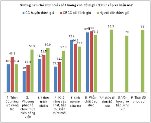 Về chất lượng, trình độ chuyên môn nghiệp vụ nhìn chung còn thấp so với mặt bằng chung của đội ngũ cán bộ, công chức các cấp. Số cán bộ, công chức cấp xã có trình độ chuyên môn nghiệp vụ tốt nghiệp trung cấp chiếm tỷ lệ còn lớn (cán bộ cấp xã chiếm tỷ lệ 38,30%; công chức cấp xã chiếm tỷ lệ 51,6%). Trong thực tế vẫn còn không ít cán bộ, công chức cấp xã mới chỉ dừng lại ở trình độ “cầm tay chỉ việc”. Nhiều cán bộ, công chức chuyên môn nghiệp vụ không đúng chuyên ngành nên chưa am hiểu nhiều về lĩnh vực chuyên môn, bởi vậy khó có thể tham mưu được cho sự phát triển kinh tế - xã hội ở địa phương. Đạo đức công vụ và kỷ luật, kỷ cương hành chính trong hoạt động của hệ thống chính trị cơ sở cũng đang là những vấn đề rất bức xúc trong cải cách, nâng cao hiệu lực, hiệu quả của quản trị quốc gia. Chưa phân định rõ ràng giữa trách nhiệm tập thể với trách nhiệm của cá nhân, chưa có cơ chế để kịp thời thay thế những cán bộ, công chức không đáp ứng yêu cầu nhiệm vụ. Một số cán bộ, công chức cấp xã vẫn chưa chấp hành đúng các nội quy, quy định của cơ quan về giờ giấc làm việc, thái độ chưa nhiệt tình hướng dẫn nhân dân trong giải quyết công việc, xử lý công việc còn chậm trễ dẫn đến người dân chưa hài lòng, gây bức xúc trong nhân dân.
