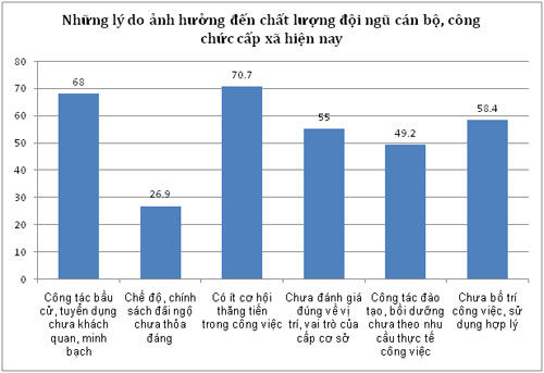 Những hạn chế trên của đội ngũ cán bộ, công chức cấp xã do nhiều nguyên nhân, kết quả điều tra dự án đã cho thấy có các nguyên nhân cơ bản như: Có ít cơ hội thăng tiến trong công việc (70.7%); Công tác bầu cử, tuyển dụng chưa khách quan, minh bạch (68.0%); Chưa bố trí công việc, sử dụng hợp lý (58.4%); Chưa đánh giá đúng về vị trí, vai trò của cấp cơ sở (55.0%); Công tác đào tạo, bồi dưỡng chưa theo nhu cầu thực tế công việc (49.2%); Chế độ, chính sách đãi ngộ chưa thỏa đáng (26.9%).