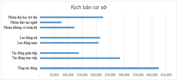 Trong kịch bản cơ sở, tổng số lao động bị ảnh hưởng ước tính khoảng 424 nghìn người. Trong đó, tác động trực tiếp đến lao động trong khu vực doanh nghiệp chiếm khoảng 67% tổng số lao động bị ảnh hưởng, tương đương khoảng 285 nghìn người, chủ yếu do các doanh nghiệp giảm sản lượng sản xuất do sụt giảm đơn hàng. Tác động gián tiếp chiếm khoảng 33%, khoảng 138 nghìn người, đến từ các ngành cung ứng đầu vào, logistics, vận tải và các dịch vụ liên quan. Tác động làm mất việc làm ở khu vực công nghiệp chế biến chế tạo (CNCBCT) khoảng 330 nghìn người, trong đó khu vực doanh nghiệp của nhóm ngành này khoảng 264 nghìn người, tương đương 3,4% tổng số lao động trong các doanh nghiệp ngành CNCBCT sẽ mất việc.