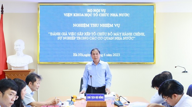 Ngày 20/6/2023, tại trụ sở Bộ Nội vụ, Viện Khoa học tổ chức nhà nước đã tổ chức nghiệm thu nhiệm vụ “Đánh giá việc sắp xếp tổ chức bộ máy hành chính, sự nghiệp trong các cơ quan nhà nước” do Viện Khoa học tổ chức nhà nước là tổ chức chủ trì thực hiện. Hội đồng nghiệm thu (Hội đồng) có 07 thành viên; PGS.TS. Triệu Văn Cường, Thứ trưởng Bộ Nội vụ làm Chủ tịch Hội đồng.
