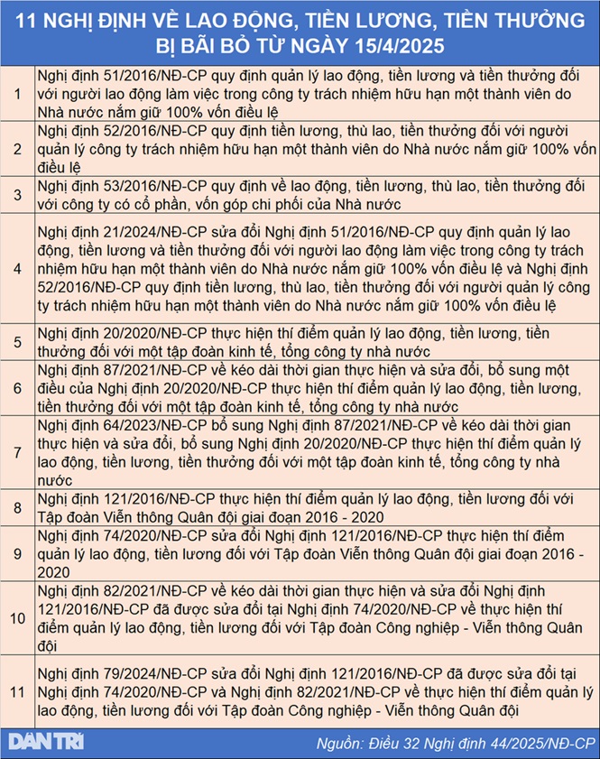 Đồng thời, từ thời điểm Nghị định 44/2025/NĐ-CP thi hành, 11 nghị định liên quan đến chế độ lao động, tiền lương, tiền thưởng trong doanh nghiệp nhà nước được ban hành trước đây sẽ bị bãi bỏ. Cụ thể như sau: