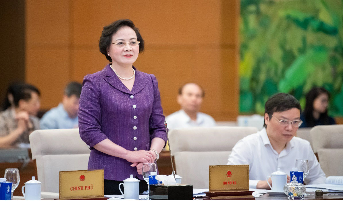 Bộ trưởng Nội vụ Phạm Thị Thanh Trà báo cáo tại phiên họp Ủy ban Thường vụ Quốc hội về những nội dung sửa đổi, bổ sung của Luật Tổ chức chính quyền địa phương (Ảnh: Hồng Phong).