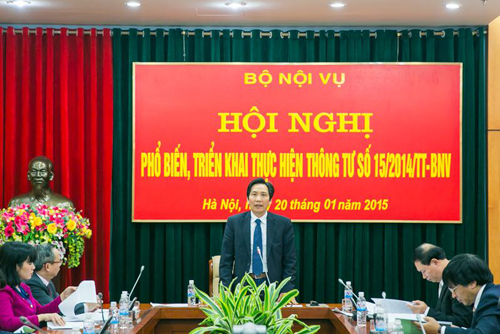 Sáng ngày 20/1/2015, tại Hà Nội, Bộ Nội vụ đã tổ chức Hội nghị phổ biến, triển khai thực hiện Thông tư số 15/2014/TT-BNV ngày 31/10/2014 của Bộ Nội vụ hướng dẫn chức năng, nhiệm vụ, quyền hạn và cơ cấu tổ chức của Sở Nội vụ thuộc UBND tỉnh, thành phố trực thuộc Trung ương; Phòng Nội vụ thuộc UBND huyện, quận, thị xã, thành phố thuộc tỉnh.