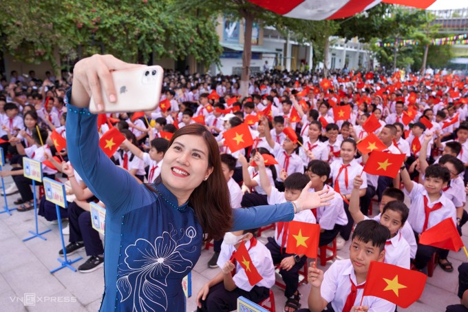 Giáo viên tại trường THCS Nguyễn Huệ, Đà Nẵng chụp ảnh cùng học sinh trong năm học mới 2024-2025. Ảnh: Nguyễn Đông