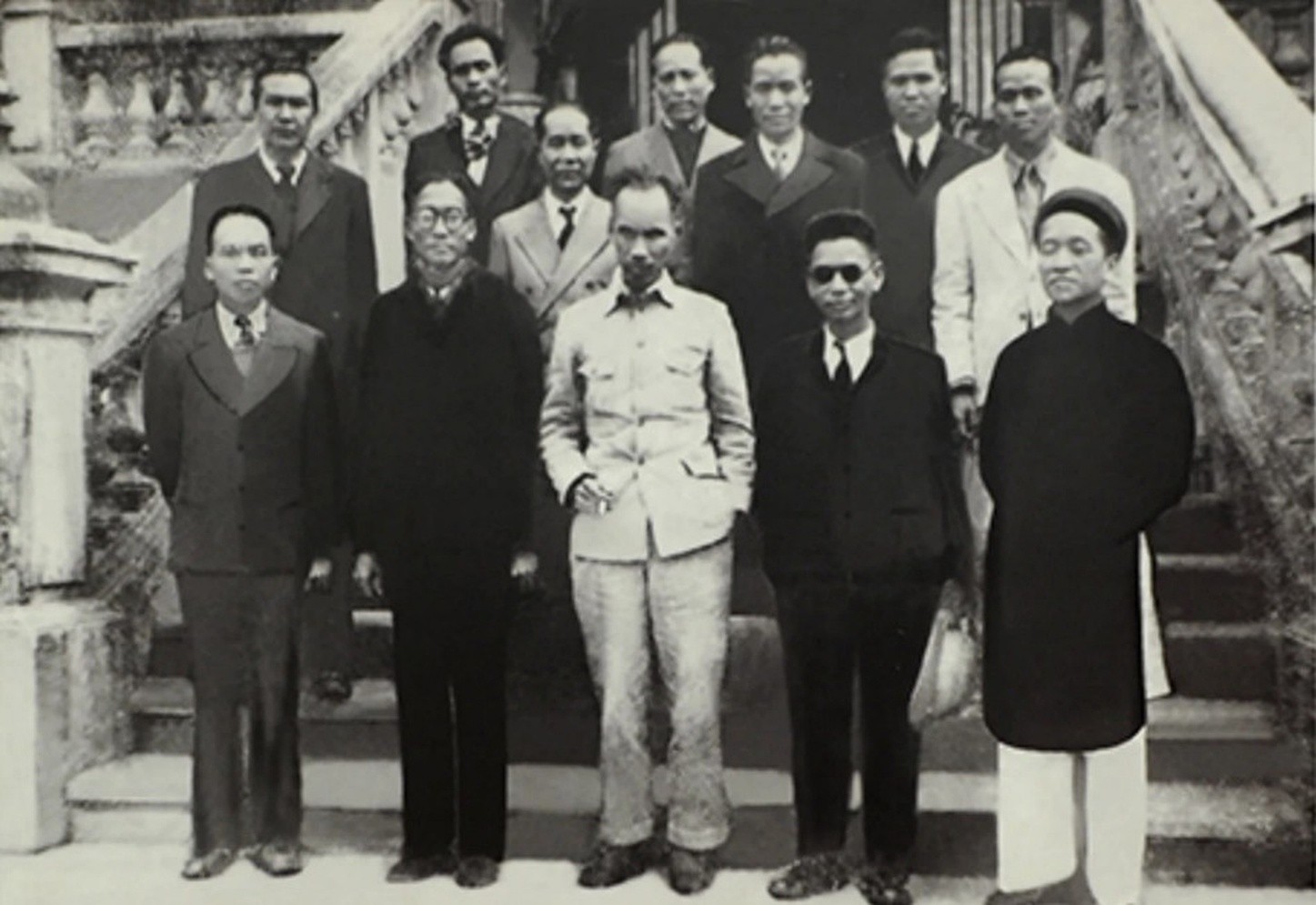 Chủ tịch Hồ Chí Minh và các thành viên Hội đồng Chính phủ Lâm thời nước Việt Nam Dân chủ Cộng hòa ra mắt sau phiên họp đầu tiên, sáng 3/9/1945 (Ảnh: Tư liệu).