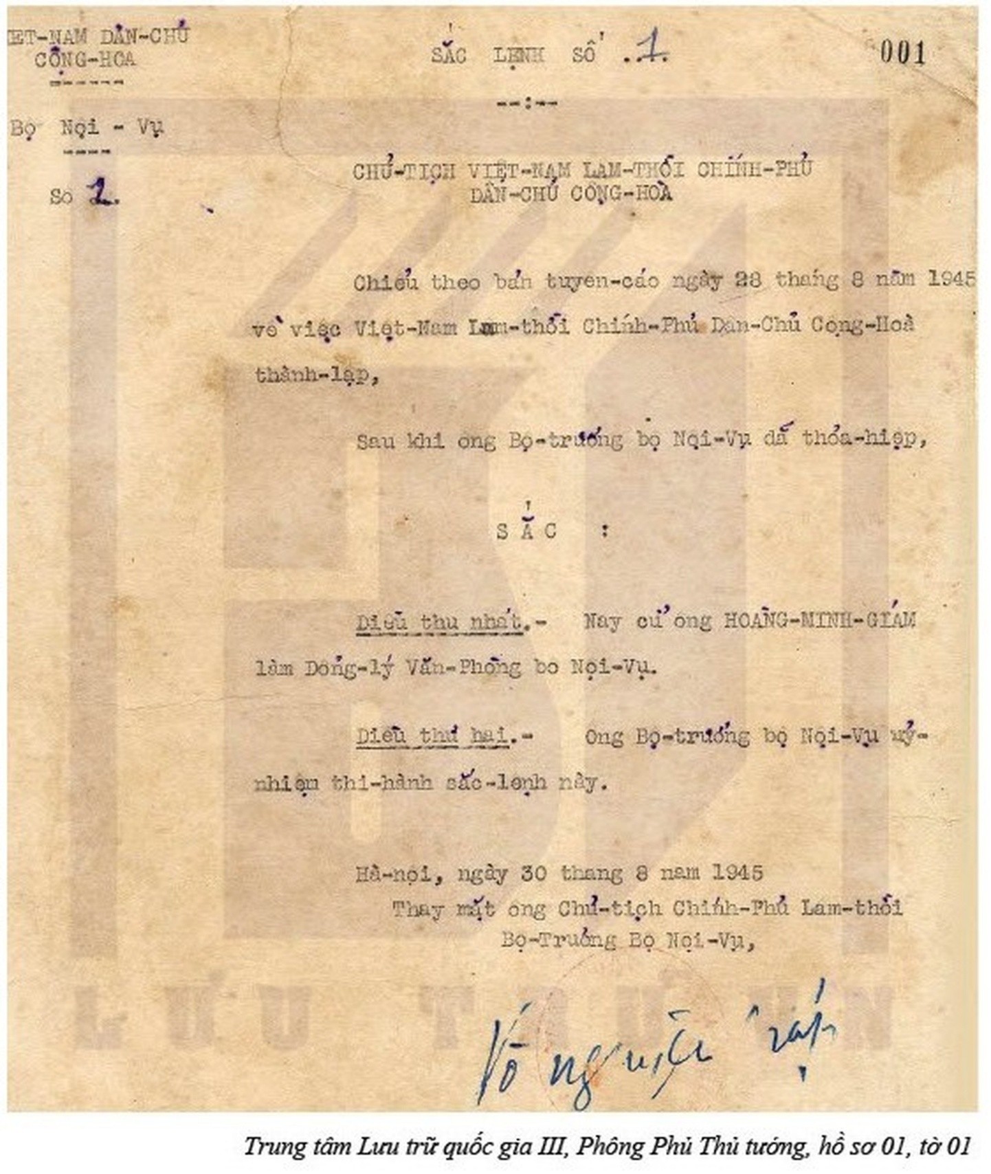 Sắc lệnh số 01-SL cử ông Hoàng Minh Giám làm Đổng lý Văn phòng Bộ Nội vụ (Nguồn: Trung tâm Lưu trữ quốc gia III).