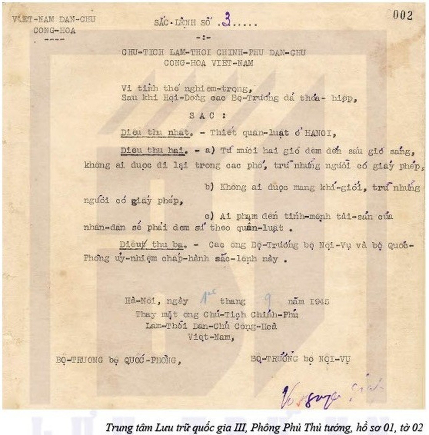 Sắc lệnh số 03-SL cũng được chính Bộ trưởng Võ Nguyên Giáp ký ban hành vào ngày 1/9/1945, yêu cầu thiết quân luật ở Hà Nội ngay trước ngày Chính phủ long trọng tổ chức lễ Quốc khánh tại quảng trường Ba Đình.