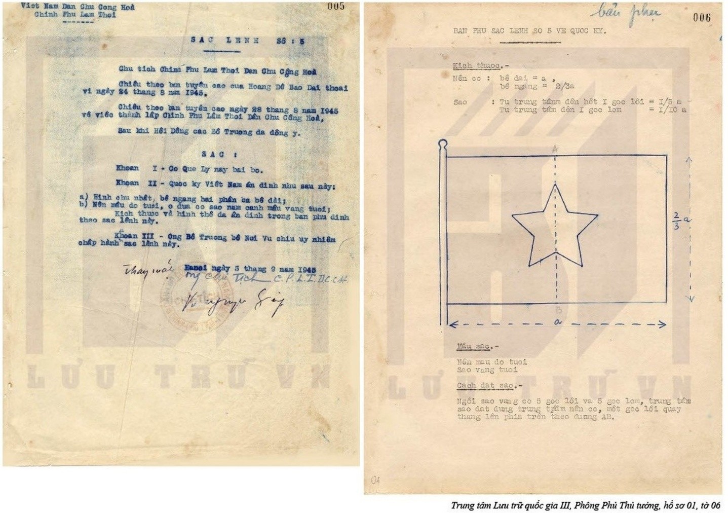 Đặc biệt, vào ngày 5/9/1945, Chính phủ lâm thời ban hành Sắc lệnh số 05-SL về việc công bố Quốc kỳ Việt Nam. Sắc lệnh này quy định Quốc kỳ Việt Nam hình chữ nhật, bề ngang bằng hai phần ba bề dài, nền màu đỏ tươi, ở giữa có sao năm cánh màu vàng tươi.