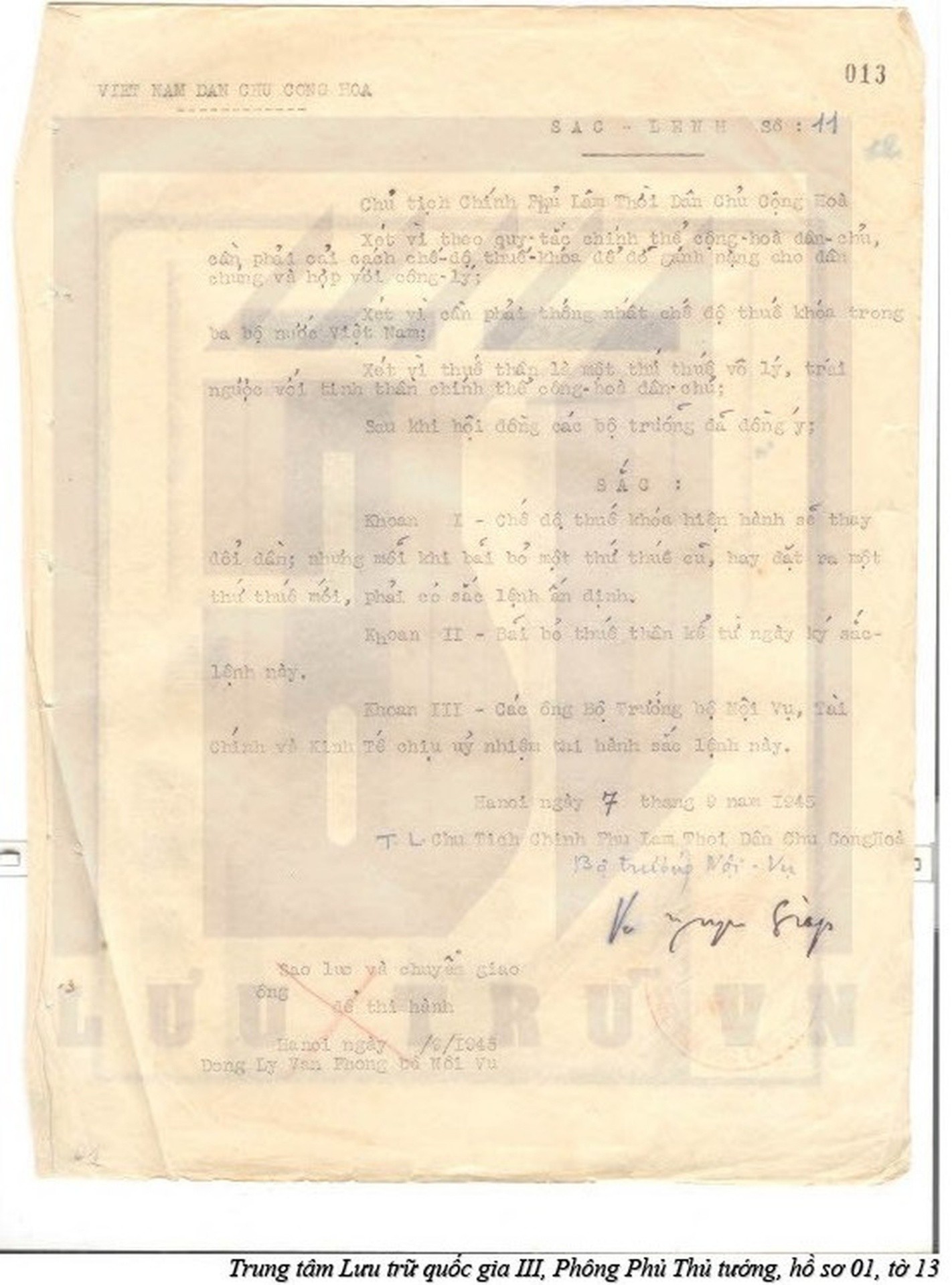 Sắc lệnh số 11-SL bãi bỏ thuế thân (Nguồn: Trung tâm Lưu trữ quốc gia III).