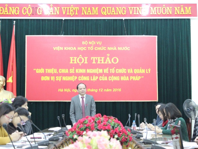 Trong khuôn khổ hợp tác nghiên cứu khoa học giữa Viện Khoa học tổ chức nhà nước, Bộ Nội vụ Việt Nam và Đại sứ quán Cộng hòa Pháp tại Hà Nội, trong hai ngày 15-16/12/2016, Viện Khoa học tổ chức nhà nước đã phối hợp với Đại sứ quán Cộng hòa Pháp tổ chức hội thảo “Giới thiệu, chia sẻ kinh nghiệm về tổ chức và quản lý đơn vị sự nghiệp công lập của cộng hòa Pháp” (Hội thảo).