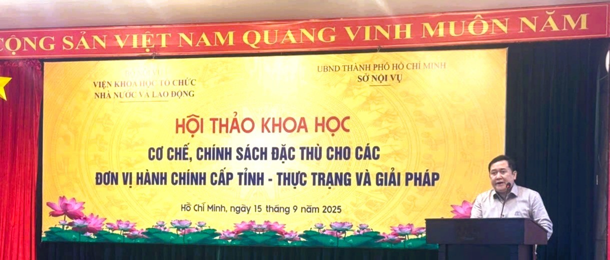Ngày 15/9/2025, tại hội trường Nhà khách Quốc hội (165 Nam Kỳ Khởi Nghĩa, TP. Hồ Chí Minh), Viện Khoa học Tổ chức nhà nước và Lao động đã tổ chức Hội thảo khoa học với chủ đề: “Cơ chế chính sách đặc thù cho các đơn vị hành chính cấp tỉnh - Thực trạng và giải pháp”. TS. Lê Anh Tuấn, Viện trưởng Viện Khoa học Tổ chức nhà nước và Lao động, dự và chủ trì Hội thảo.