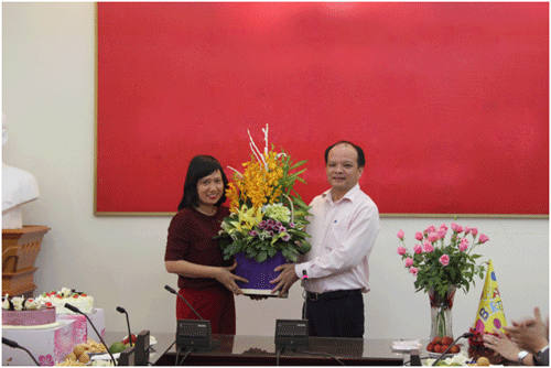Phó Chủ tịch Công đoàn Viện Đỗ Thị Thu Hằng thay mặt toàn thể chị em phụ nữ Viện nhận hoa chúc mừng nhân ngày 20/10 từ Viện trưởng Trần Văn Ngợi