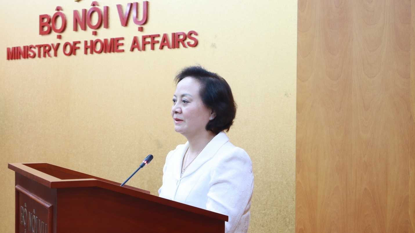 Bộ trưởng Phạm Thị Thanh Trà phát biểu giao nhiệm vụ cho hai đồng chí tân lãnh đạo Viện Khoa học tổ chức nhà nước tại buổi Lễ