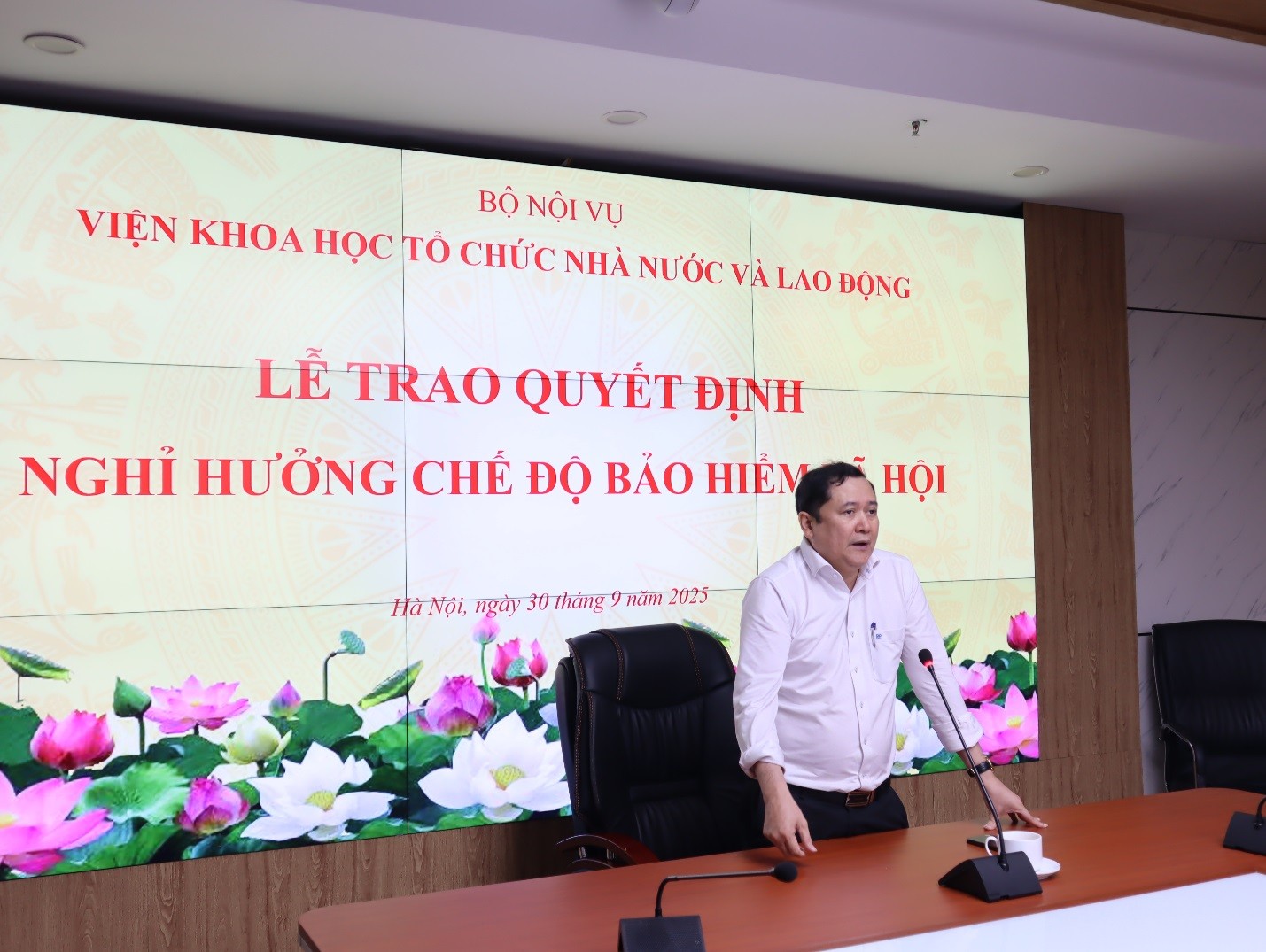 Tại buổi Lễ, bà Trần Thị Vân – Chánh Văn phòng Viện Khoa học Tổ chức nhà nước và Lao động đã công bố Quyết định số 135/QĐ-VKHTCNN&LĐ ngày 31/7/2025 của Viện Khoa học Tổ chức nhà nước và Lao động về việc nghỉ hưu trước tuổi để hưởng chế độ bảo hiểm xã hội đối với bà Lưu Thị Lan Anh – Phó Chánh Văn phòng, Viện Khoa học Tổ chức nhà nước và Lao động kể từ ngày 01/10/2025;