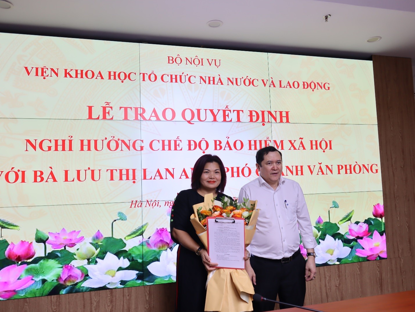 Ông Lê Anh Tuấn, Viện trưởng Viện KHTCNN&LĐ trao Quyết định nghỉ hưu trước tuổi và tặng hoa chúc mừng bà Lưu Thị Lan Anh