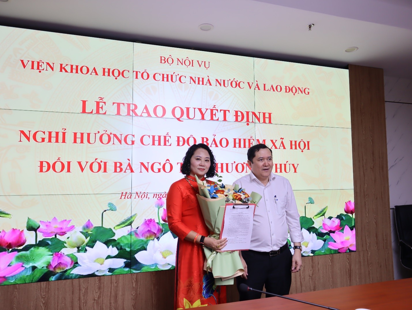 Ông Lê Anh Tuấn, Viện trưởng Viện KHTCNN&LĐ trao Quyết định nghỉ hưu trước tuổi và tặng hoa chúc mừng bà Ngô Thị Phương Thúy