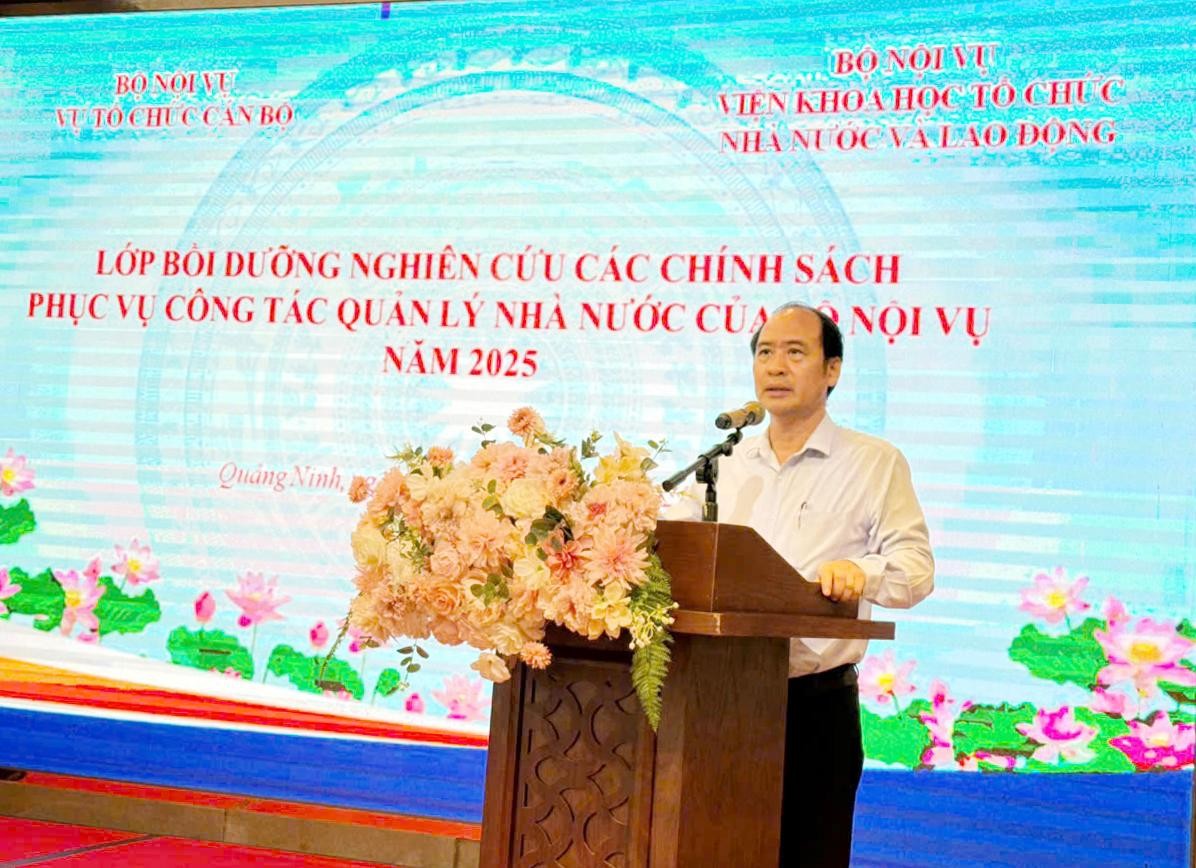Thực hiện Quyết định số 617/QĐ-BNV ngày 16/6/2025 của Bộ trưởng Bộ Nội vụ, trong hai ngày 09 – 10/10/2025, tại Quảng Ninh, Viện Khoa học Tổ chức nhà nước và Lao động chủ trì, phối hợp với Vụ Tổ chức cán bộ tổ chức Lớp bồi dưỡng nghiên cứu các chính sách phục vụ công tác quản lý nhà nước của Bộ Nội vụ năm 2025. TS. Nguyễn Văn Hồi - Thứ trưởng Bộ Nội vụ tham dự và khai mạc Lớp bồi dưỡng.