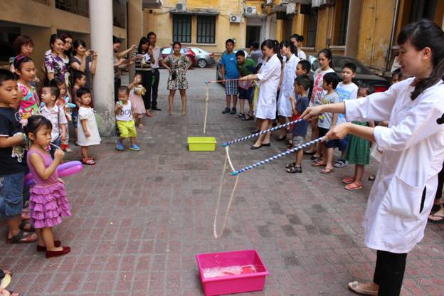 Tiếp theo chương trình, các cháu thiếu nhi được trải nghiệm những thí nghiệm khoa học mới mẻ, lôi cuốn, hấp dẫn do các “Nhà khoa học” đến từ Học viện Khám phá hướng dẫn. Các cháu thiếu nhi đã hết sức hào hứng tham gia các thí nghiệm như: Câu đá; Làm kem trong 5 phút; Khám phá nhiệt độ đá muối; Vòng quay ly tâm; Bong bóng khổng lồ. Đặc biệt, các cháu thiếu nhi khi tham gia thí nghiệm “Làm kem trong 5 phút” đã thể hiện sự thích thú, phấn khích khi tự làm và được thưởng thức món kem ngon tuyệt do chính mình làm ra. Bên cạnh việc được tham gia những thí nghiệm hấp dẫn, các cháu thiếu nhi còn được biết thêm về những kiến thức khoa học để vận dụng trong học tập, cuộc sống hàng ngày và giúp đỡ gia đình từ những kiến thức đó. Cũng qua các thí nghiệm các cháu thiếu nhi còn được học hỏi thêm những bài học về lòng kiên nhẫn, sự may mắn, thành công hay chưa thành công trong thí nghiệm khoa học cũng như trong cuộc sống.