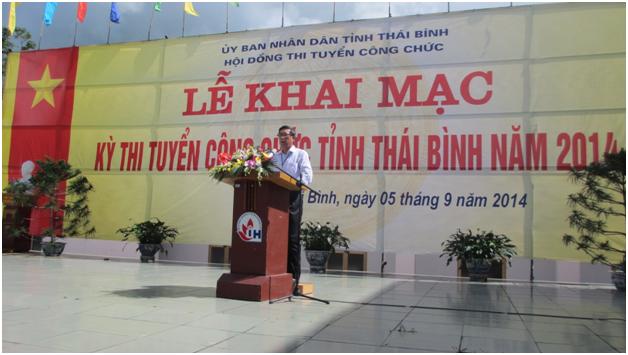 Phát biểu khai mạc kỳ thi tuyển dụng công chức năm 2014 của tỉnh Thái Bình, Phó Chủ tịch UBND tỉnh, Chủ tịch Hội đồng thi tuyển công chức tỉnh Thái Bình Phạm Văn Ca đã cho biết: Thực hiện sự chỉ đạo của Thường trực Tỉnh uỷ, năm 2014 Ủy ban nhân dân tỉnh đã xây dựng kế hoạch thi tuyển công chức đối với cơ quan đảng, đoàn thể cấp tỉnh, cấp huyện; công chức hành chính ở cấp tỉnh, cấp huyện và công chức cấp xã. Các văn bản liên quan đến kỳ thi tuyến công chức đã được đăng tải trên Cổng thông tin điện tử của tỉnh và trên các phương tiện thông tin đại chúng, tại các cơ quan, đơn vị; mọi công dân có đủ điều kiện, tiêu chuẩn đều được đăng ký dự thi. Điểm mới của kỳ thi tuyển dụng công chức năm 2014 là các thí sinh thi 03 môn thi trắc nghiệm: Chuyên ngành, Tin học và Tiếng Anh trên máy tính. Hội đồng thi tuyển công chức đã thông báo trên Cổng thông tin điện tử của tỉnh và gửi giấy báo cho thí sinh biết lịch thi, ca thi trên máy tính. Đồng thời, hướng dẫn các bước làm bài thi và tập làm thử đề thi theo hướng dẫn của Bộ Nội vụ. Các thí sinh biết điếm bài thi của mình ngay sau khi kết thúc môn thi đó. Điểm của bài thi được chấm theo thang điểm 100. Thí sinh đạt điểm của các môn thi từ 50 điểm trở lên thì được thi tiếp 02 môn thi viết kiến thức chung và môn nghiệp vụ chuyên ngành vào ngày 12/9/2014.