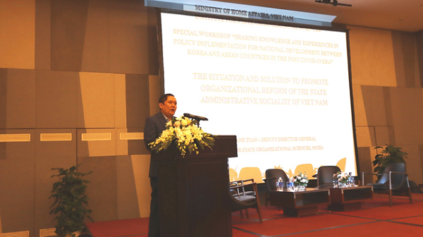 PGS.TS. Triệu Văn Cường, Thứ trưởng Bộ Nội vụ phát biểu khai mạc Hội thảo.Phát biểu khai mạc Hội thảo, PGS.TS. Triệu Văn Cường Thứ trưởng Bộ Nội vụ nhấn mạnh: từ cuối năm 2019, cả thế giới phải đối mặt với đại dịch Covid-19 diễn biến phức tạp, khó kiểm soát, gây ra suy thoái trầm trọng và khủng hoảng kinh tế toàn cầu, làm thay đổi sâu sắc trật tự, cấu trúc kinh tế, phương thức quản trị toàn cầu, cách thức hoạt động kinh tế và tổ chức đời sống xã hội của thế giới. Hậu Covid-19 gây ra các biến động, bất ổn về môi trường địa kinh tế; đồng thời, địa chính trị trên thế giới lại diễn biến phức tạp, gây chia rẽ giữa các nước, các khối, các khu vực, cạnh tranh chiến lược giữa các nước lớn rất phức tạp, gay gắt; cục diện đa cực ngày càng rõ nét. Sự điều chỉnh chính sách, quan hệ đối ngoại của các nước lớn trong khu vực và trên thế giới diễn biến khó lường. Tăng trưởng kinh tế thế giới và thương mại, đầu tư quốc tế có xu hướng giảm; rủi ro trên thị trường tài chính, tiền tệ quốc tế có xu hướng gia tăng. Do đó đòi hỏi mỗi quốc gia cần tiếp tục nghiên cứu đưa ra các sáng kiến mới nhằm cải cách khu vưc công, đổi mới phương thức quản trị quốc gia, xây dựng và nâng cao năng lực nhà nước để đáp ứng với tình hình bối cảnh quốc tế.